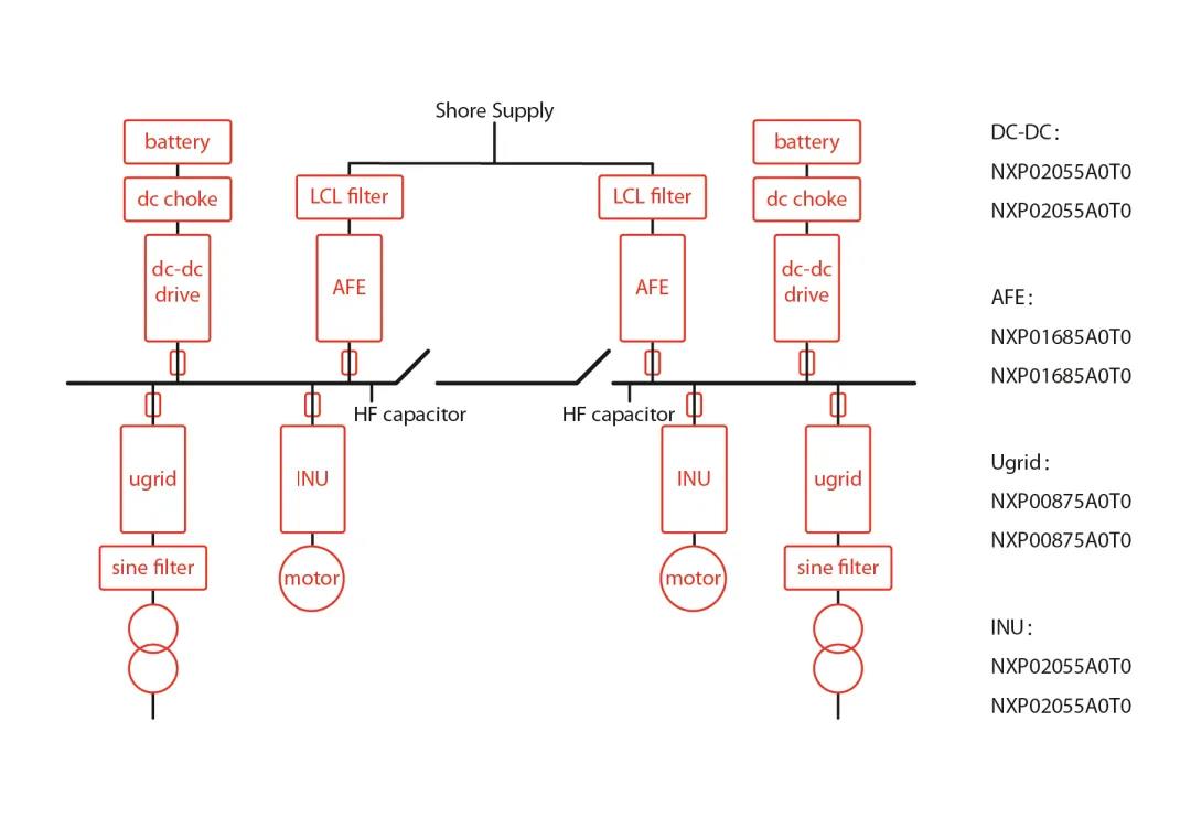 在此機櫃中,丹佛斯傳動VACON®變頻器包含了DC-DC直流電池驅動器,傳統的主推電機驅動器,低諧波AFE前端整流技術,船上日用電源。