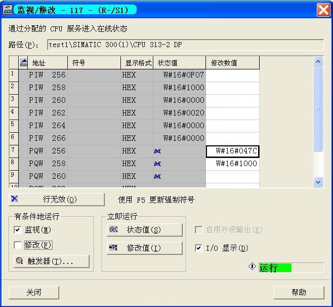 這時寫入 PCD1 控製字(示例中地址為 PQW 256) = W#16#047C(此控製字含義為“運 行”);寫入 PCD2 總線參考值(示例中地址為 PQW 258)= W#16#1000(含義為 25%),然 後按“修改值(I)”按鈕,數據就能傳送至變頻器,如果此時變頻器在 Auto-on 模式,控製 端子 12 與 27 短接,變頻器就能正常運行,而且輸出頻率為 12.5Hz。