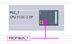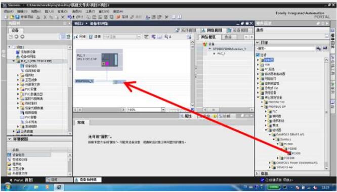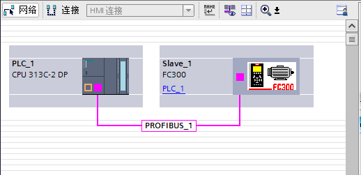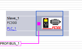 將變頻器 FC300 拖動到 PROFIBUS_1 連接線處後,PLC 和變頻器連接在一起,FC300 顯 示為未分配。