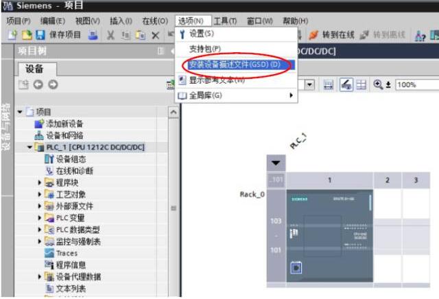 六、如果沒有安裝過 MCA120 的 GSD 文件,則需點擊‘選項’-‘安裝設備描述文件’,操作 如圖五所示。若已安裝則直接進入第六步。