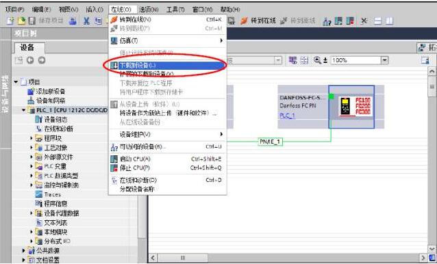 十一、下載項目至 PLC,選擇“菜單”-‘在線’-‘下載到設備’,如圖十三所示: