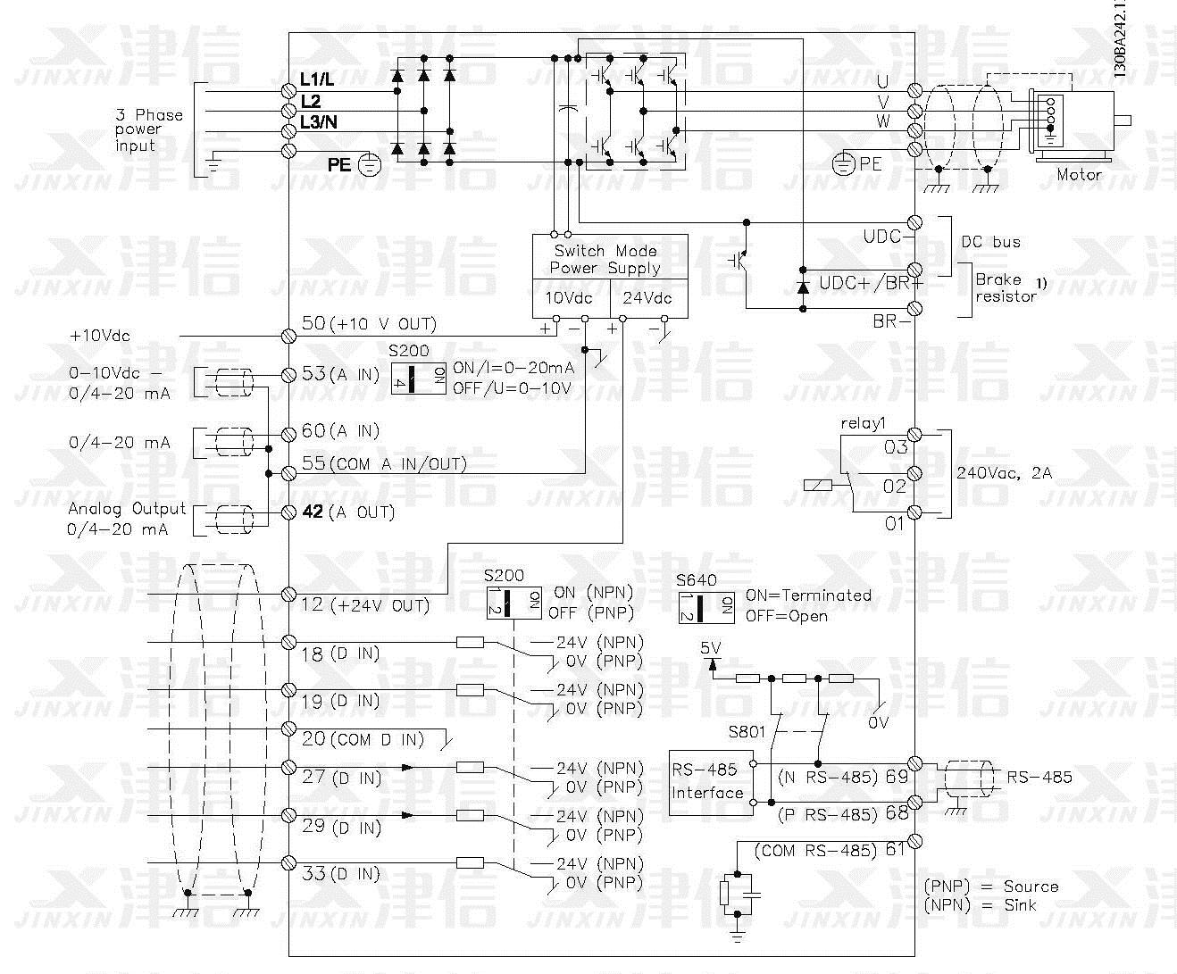 成人午夜在线观看采用交-直-交工作原理,先將三相交流電經整流部分變換成直流,經濾波後通過IGBT或其它電力電子器件逆變成頻率和電壓均可變的三相交流電供電機使用。變頻器的基本構成由主電路(包括整流器、中間直流環節、逆變器)和控製電路組成,以下是丹佛斯各係列變頻器的接線示意圖。