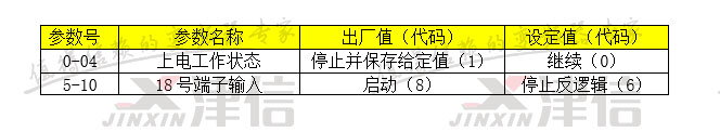 2.外部12 ,18號端子接起停控製開關。 3. 通過麵板按下麵的參數分別在0號菜單設置上電工作狀態,5號菜單設置18號端子輸入值。