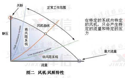 選擇風機的基本原則:在特定的係統裏特定的風機,隻會產生特定的流量和特定的壓力。風機輸出壓力特性曲線和係統風阻特性曲線的交點就是風機的工作點。