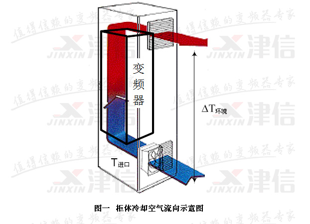 變頻器一般通過變頻器內置的風扇來散熱,如果變頻器安排在櫃體內,這會導致櫃體溫度升高。雖然櫃體的櫃壁也有一定的散熱能力,但是由於櫃體的櫃壁散熱能力小於50W,在計算中,這部分散熱可以忽略不計,所以還需要采取其他外部措施來散熱。最典型的散熱方式是在櫃門或櫃壁上安裝風扇,如圖一所示。