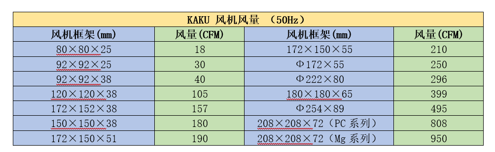 下表列出市場上比較常見的卡固(KAKU)風機的數據,作為午夜视频福利上麵例子的風機選型參考。