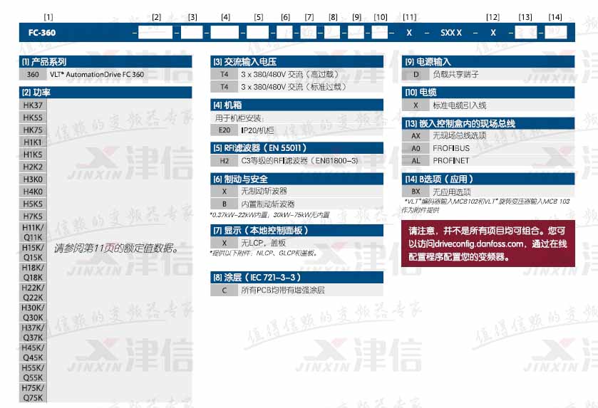 如FC360H1K5T4E20H2BXCDXXSXXXXALBX,代表380V,1.5KW,IP20,C3等級內置濾波器,內置製動,PROFINET現場總線