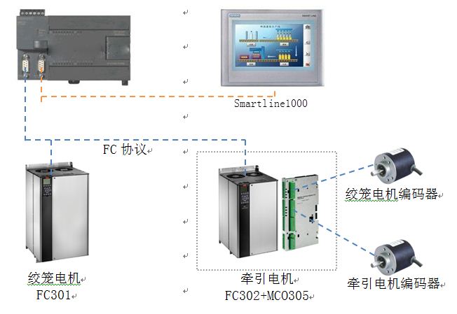 PLC的PORT1口與兩台變頻器在一個總線上,采用FC協議進行通信;PORT0則連接西門子的人機屏。其中牽引電機變頻器FC302上,安裝MCO305選件卡,同時將兩個電機的編碼器都接到MCO305上。由絞籠電機作為主軸,牽引電機作為從軸與主軸同步運動。