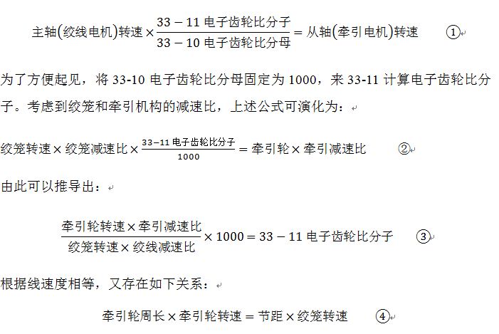 其中,絞籠轉速、節距由操作者給出,牽引輪周長、牽引減速比和絞線減速比取決於機械結構,由以上公式④推導出牽引輪轉速並帶入公式③,即可求出電子齒輪比分子,在計算的過程中須保證單位統一,計算出的電子齒輪比分子轉化為整數並通過FC協議寫入FC302的33-11參數。