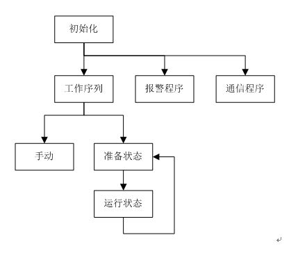 開機後,首先進行通信和狀態的初始化。初始化完成後同時調用工作序列、報警和通信子程序。工作序列中,包含手動和自動兩種狀態,自動運行又包括機組準備(包括:鬆開機械抱閘、關閉防護門等動作)和機器運行兩個狀態。報警程序用於對機器狀態進行實時監控,並根據故障情況執行相關動作。通信程序用於PLC和變頻器的FC協議通信。