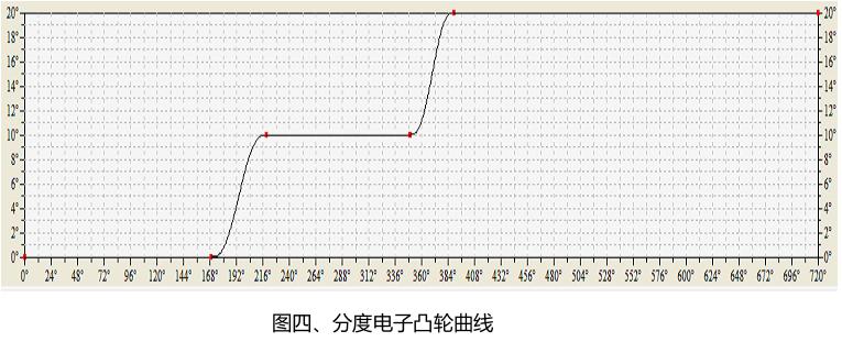 設備通過分度伺服跟隨主軸執行預先設定的電子凸輪數據,從而達到對定子的分度控製。分度電子凸輪曲線如圖四所示。