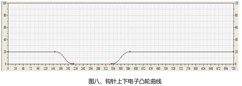 首先構建好凸輪曲線,使用“MC_CamTableSelect”指令選擇對應的凸輪曲線;再通過“MC_Camin”指令使得主軸與從軸按照選定的凸輪曲線齧合(如圖六所示)。構建完成的鉤針角度電子凸輪曲線如圖七所示,構建完成的鉤針上下電子凸輪曲線如圖八所示,