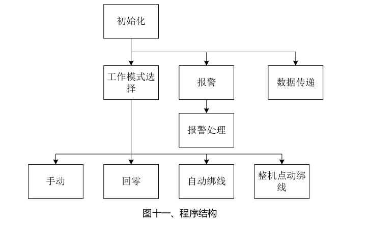 初始化程序負責在控製器送電開機後,對運動控製器的通訊端口、I/0端口以及程序進行初始化操作;然後起動後台報警程序,用於監控機器的故障狀態,當設備發故障後,根據故障的等級,令設備執行急停、暫停、警告等相對應的處理;然後進入回零模式,找到各軸的零位,並令各軸進入工作起始位置;隻有等回零模式完成以後,設備才能進入自動工作模式;最後程序根據客戶選擇的工作模式,在得到起動命令以後,正式開始運行。一台定子綁紮完畢以後,定子被自動送出,這時程序回到前麵狀態,等待新的起點命令。如此周而複始。