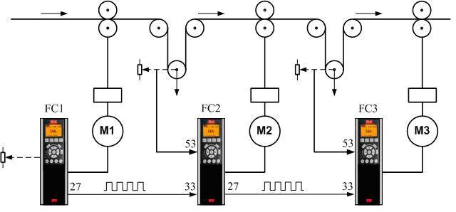 FC1工作在開環狀態。其速度輸出送往後段作為擴展PID控製的前饋輸入,可采用脈衝方式或模擬量方式。後段變頻器同時要引入此驅動器前側的跳舞輪處電位器反饋信號。理想狀態是在跳舞輪處於最佳位置時,電位器位於5V位置。