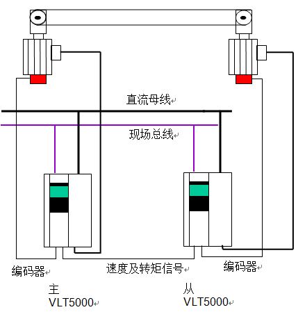 變頻器由共用直流母線供電, 丹佛斯可提供整流/回饋裝置或由用戶提供. 各分部速度可由現場總線提供, 也可由變頻器本身形成速度鏈. 變頻器采用速度閉環控製. 從變頻器的速度參考值由主變頻器給定. 同時主變頻器提供給從變頻器轉矩信號. 從變頻器根據其轉矩與主變頻器的差別, 動態修正從變頻器的轉速, 從而保證兩個變頻器出力一致. 所有運算通過可自由編程的工藝控製卡實現.