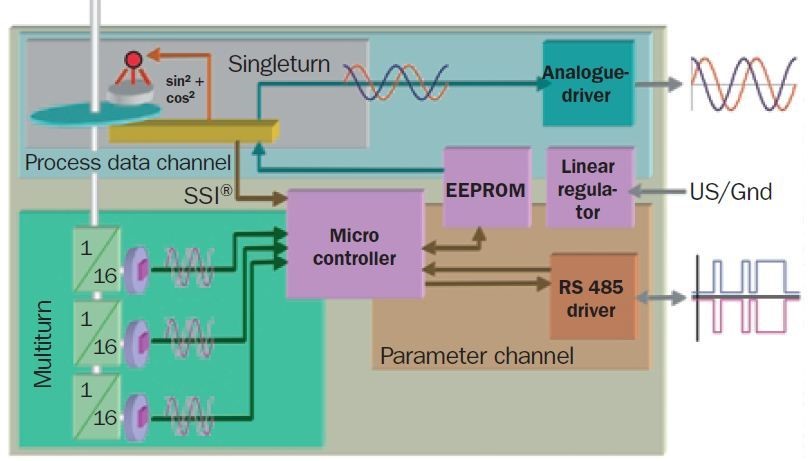 HIPERFACE編碼器是一種串行絕對位置和正餘弦模擬量信號混合編碼器,內部原理框圖見圖1。