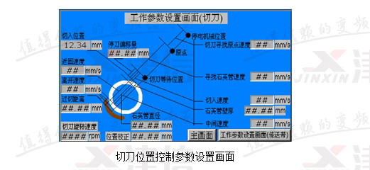 石英切割機有三個控製部分構成:切刀旋轉控製、切刀位置控製和送料位置控製。切刀旋轉控製隻要速度可調即可;切刀位置控製需要在切割石英管或石英棒的過程中控製其位置和不同段內的速度,首先要保證切割產品的刀口質量,同時要提高生產效率;送料位置控製需要每次往前送設定長度的石英管或石英棒,精度要求0.2毫米。